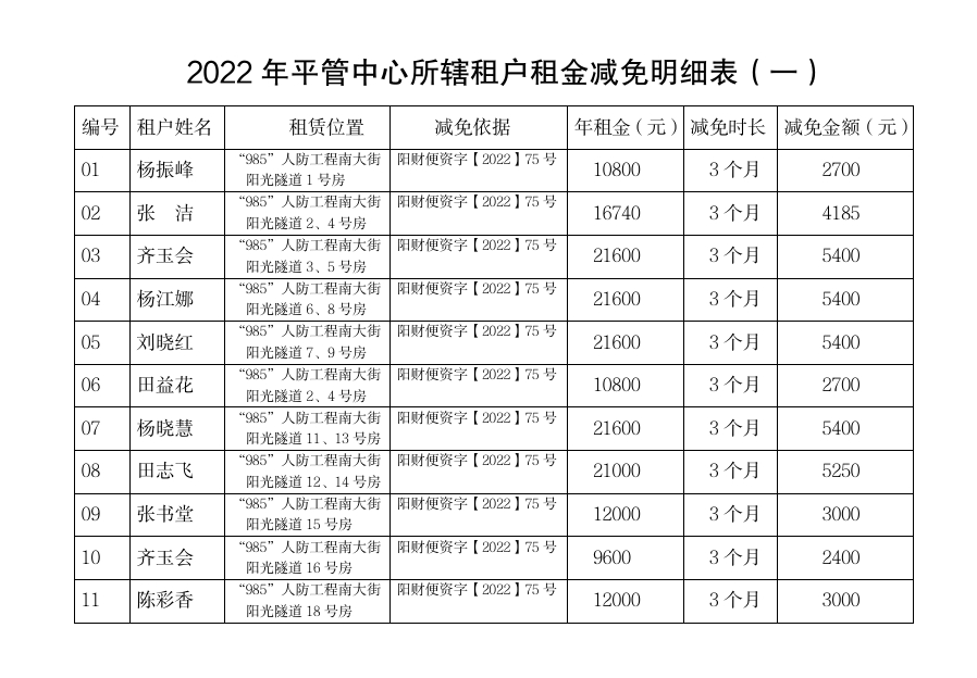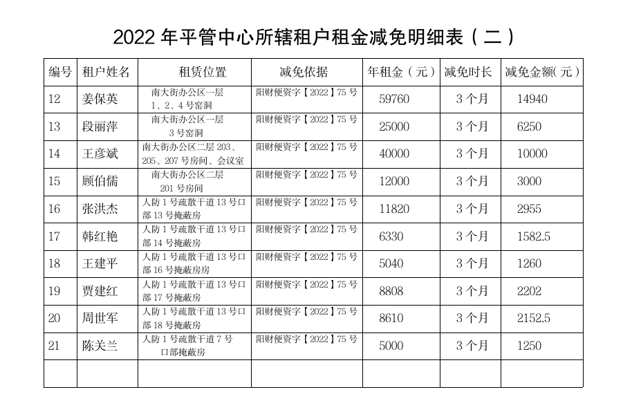 2022年平管中心所辖租户租金减免明细表
