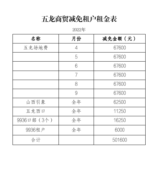 阳泉市人防办五龙商贸减免租户租金表