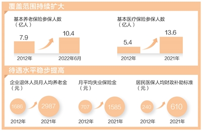 截至2022年6月,基本养老保险参保人数达到10.4亿人;基本医疗保险参保人数2021年底已达13.6亿人,覆盖率稳定在95%以上……更公平、更可靠、可持续的社会保障体系,托举起人民群众稳稳的幸福。