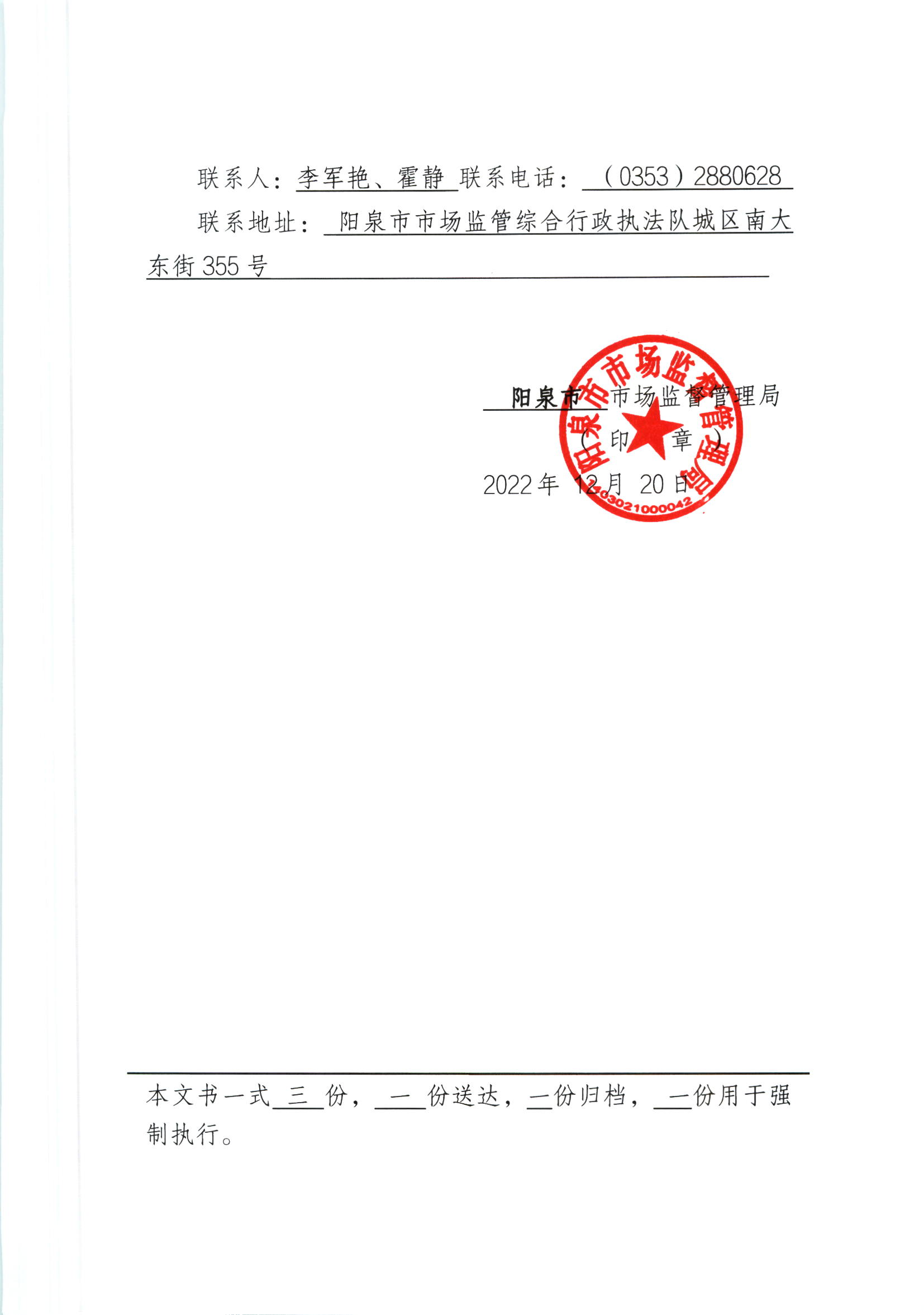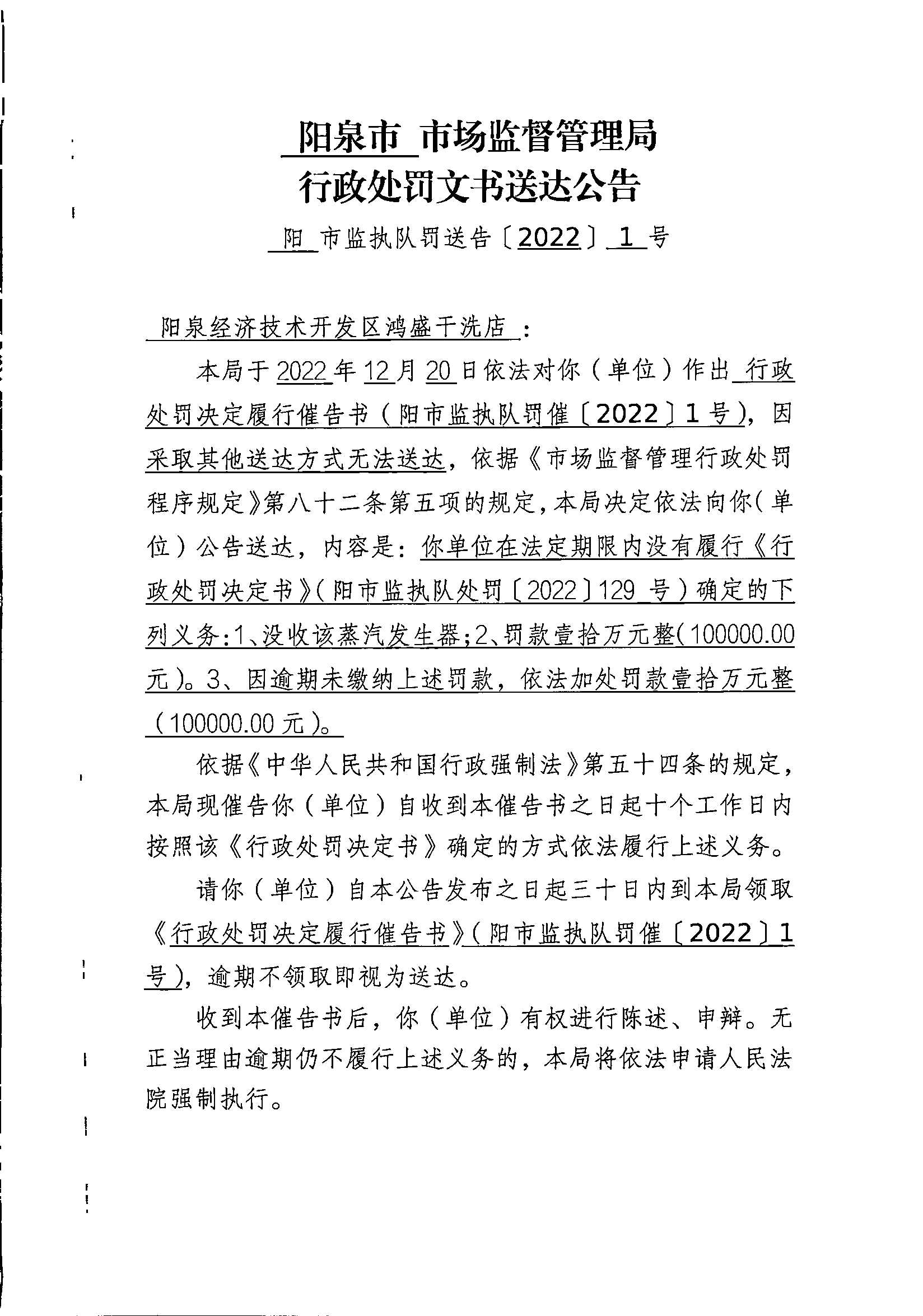 阳泉市市场监督管理局行政处罚文书送达公告