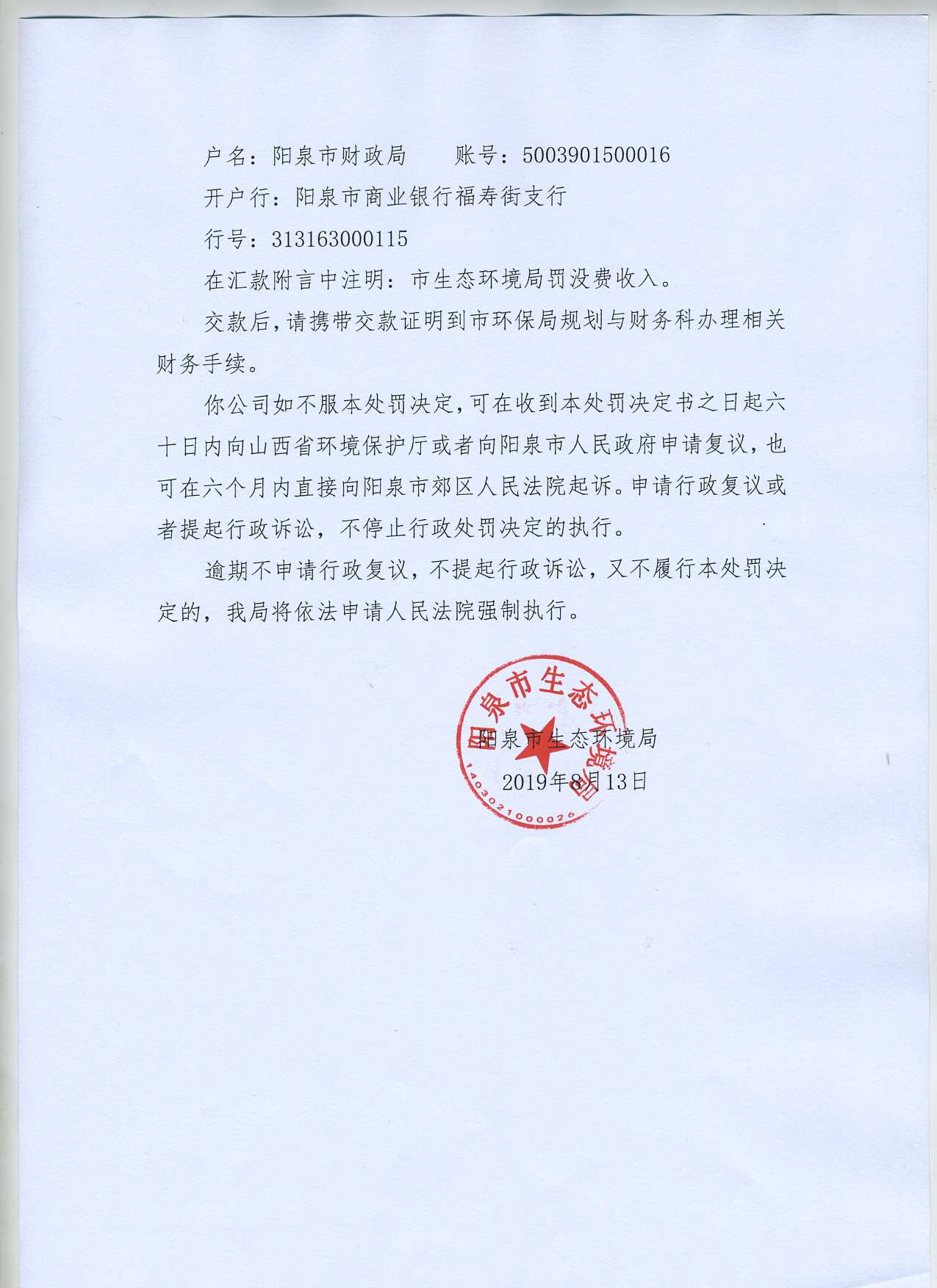 阳泉市鑫和工贸公司行政处罚决定书----阳环罚字[2019]23号