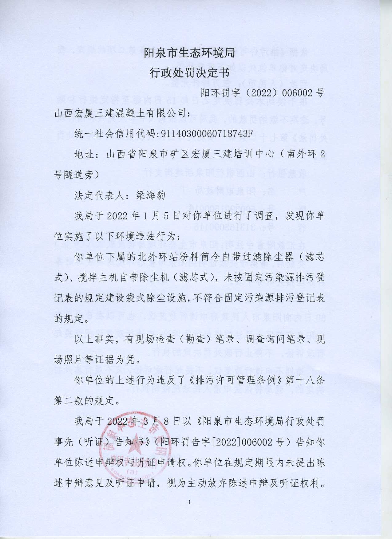 山西宏厦三建混凝土有限公司----阳环罚字(2022)006002号