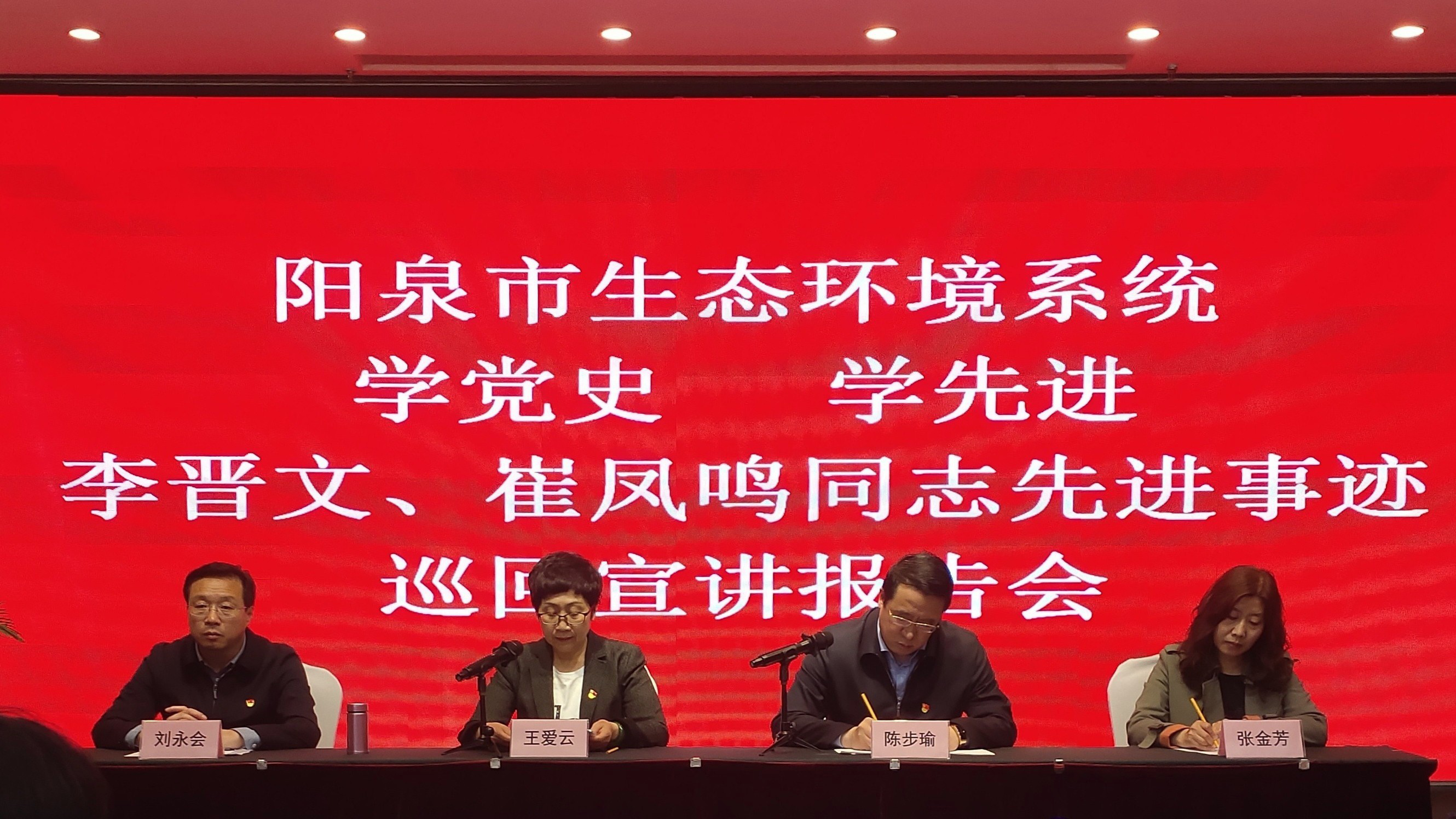4月28日上午,阳泉市生态环境系统组织召开“学党史 学先进”李晋文、崔凤鸣先进事迹巡回宣讲报告会。宣讲团团长、省生态环境厅二级巡视员王爱云,宣讲团副团长、晋城市生态环境局副局长刘永会,市直机关工委党史学习教育第七巡回指导组张金芳及宣讲团成员赵泽宇、商李波、李宁芳、郭浩浩、王盼盼出席报告会。报告会由市生态环境局党组书记、局长陈步瑜主持,阳泉市生态环境系统110余名党员干部职工代表参加。