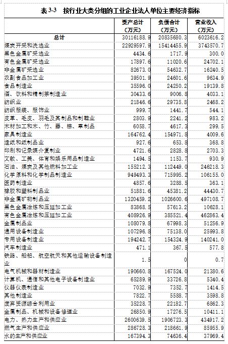 2018年末,工业企业法人单位资产总计30116188.9万元,比2013年末增长115.3%。负债合计20835680.3万元。全年实现营业收入6023616.2万元(详见表3-3)。