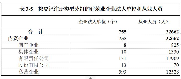 建筑业企业法人单位从业人员中,内资企业占100.0%。其中,国有企业占内资企业的2.5%,集体企业占4.1%,私营企业占38.4%(详见表3-5)。