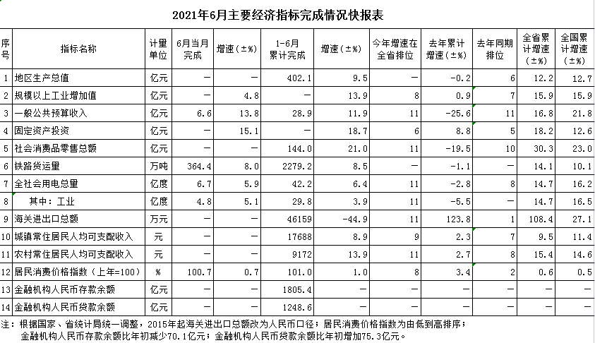 2021年上半年主要经济指标完成情况快报表