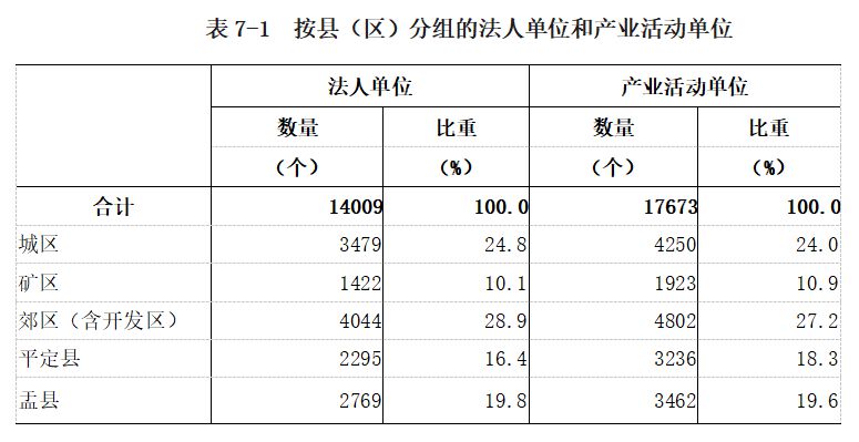 2018年末,在第二产业和第三产业法人单位中,位居前三位的县(区)是:郊区4044个,占28.8%;城区3479个,占24.8%;盂县2769个,占19.8%。