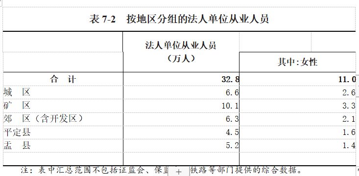 2018年末,在法人单位从业人员中,位居前三位的县(区)是:矿区10.13万人,占31.0%;城区6.63万人,占20.3%;郊区6.28万人,占19.2%。