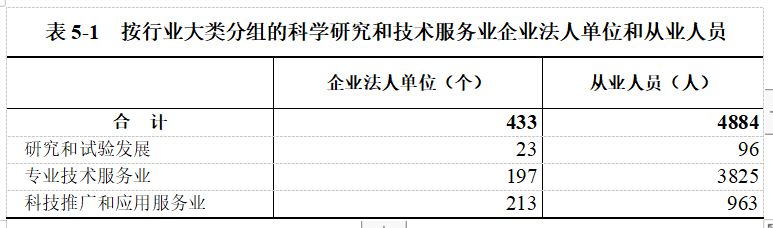 2018年末,全市共有科学研究和技术服务业法人单位536个,从业人员5911人。其中,企业法人单位433个,从业人员4884人,分别比2013年末增长382.9%和57.9%(详见表5-1)。