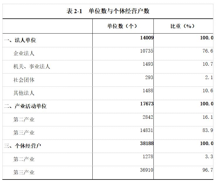 2018年末,全市共有从事第二产业和第三产业活动的法人单位14009个,比2013年末(2013年是第三次全国经济普查年份,下同)增加6330个,增长82.4%;产业活动单位17673个,增加5991个,增长51.3%;个体经营户38188个(详见表2-1)。