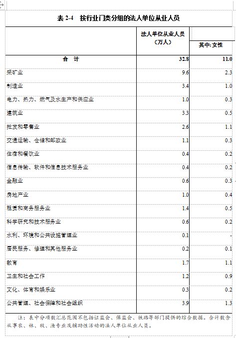 在法人单位从业人员中,位居前三位的行业是:采矿业9.6万人,占29.4%;公共管理、社会保障和社会组织3.9万人,占11.8%;制造业3.4万人,占10.3%。(详见表2-4)。