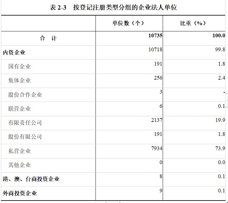 2018年末,全市共有第二产业和第三产业的企业法人单位10735个,比2013年末增加6284个,增长141.2%。其中,内资企业占99.8%,港、澳、台商投资企业占0.1%,外商投资企业占0.1%。内资企业中,国有企业占全部企业法人单位的1.8%,私营企业占73.9%(详见表2-3)。
