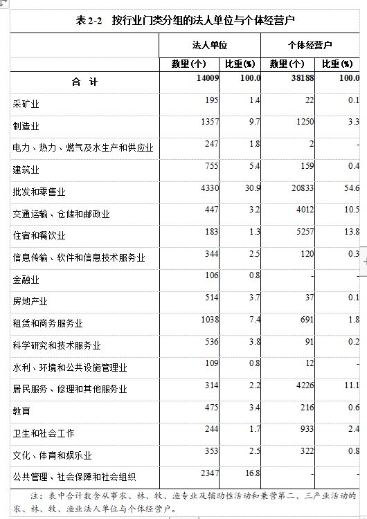 2018年末,在第二产业和第三产业法人单位中,位居前三位的行业是:批发和零售业4330个,占30.9%;公共管理、社会保障和社会组织2347个,占16.8%;制造业1357个,占9.7%。在个体经营户中,位居前三位的行业是:批发和零售业20833个,占54.6%;住宿和餐饮业5257个,占13.8%;居民服务、修理和其他服务业4226个,占11.1%(详见表2-2)。