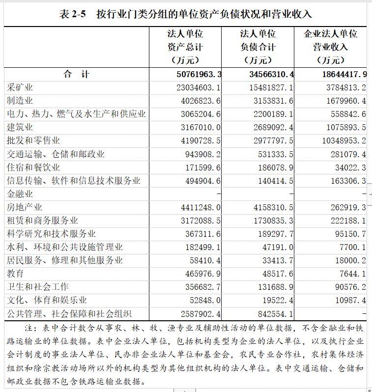 2018年末,全市第二产业和第三产业法人单位资产总计50761963.3万元,法人单位负债合计34566310.3万元;2018年企业法人单位实现营业收入18644417.9万元(不含金融业、铁路运输业单位数据,详见表2-5)。